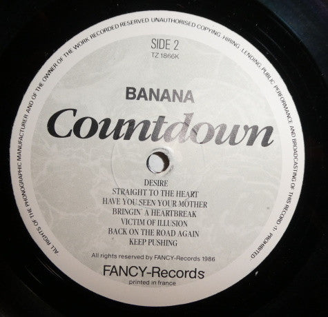 Sleeve mislabels the recording date. Recorded live on October 29th, 1986. Labels have fake song titles etc, pretending the LP is "Countdown" by "Banana" or vice versa.
