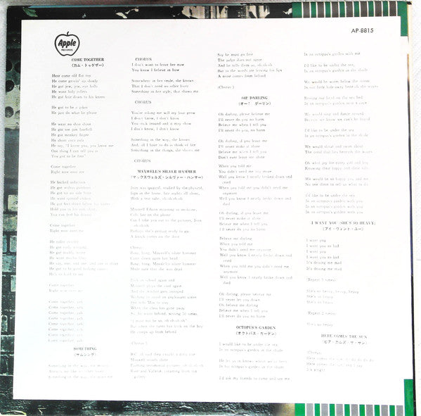 Comes with an obi strip, black inner sleeve, and lyrics insert. Later copies have a '¥ 2,200' sticker covering the '¥ 2,000' on backcover and on the obi. Typo on the backcover: A2 Maxwell's Silver Hammer A3 Something Released before October 1st, 1973 (when [l299509 was renamed to [l8185.).