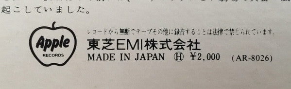 On centre labels: [l299509 On backcover: 東芝EMI株式会社 (= [l8185) Pressing must be from Oct. 1973 or shortly later (on October 1st, 1973 [l299509 was renamed to [l8185). 70s pressing, part of the Apple Records/"Beatles Forever" re-issue series, with identifying OBI strip. -Comes with an English lyric sheet insert -Disc comes in a black inner sleeve with rounded corners For a very similar issue with the same cat# but a flipback cover and a price of ¥1,700 see here. For an similar, later issue but manufactured by Toshiba-EMI Ltd. on backcover and centre labels see here.