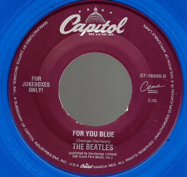 Both songs are in stereo as on the Let It Be album, with For You Blue starting with the "Queen says 'no'..." quip.