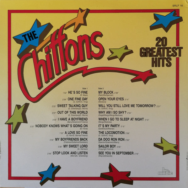 A1. He's So Fine 1:52 A2. One Fine Day 2:09 A3. Sweet Talking Guy 2:25 A4. Out Of This World 2:07 A5. I Have A Boyfriend 2:05 A6. Nobody Knows What's Going On 2:23 A7. A Love So Fine 1:53 A8. My Boyfriend Is Back 2:05 A9. My Sweet Lord 3:28 A10. Stop Look And Listen 2:49 B1. My Block 2:33 B2. Open Your Eyes 2:14 B3. Will You Still Love Me Tomorrow? 2:21 B4. Why Am I So Shy? 2:04 B5. When I Go To Sleep At Night 2:12 B6. It's My Party 2:15 B7. The Locomotion 2:08 B8. Da Doo Ron Ron 2:00 B9. Sailor Boy 2:55 B10. See You In September 2:16