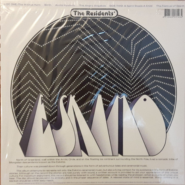 "Eskimo Stories" can be found inside the gatefold cover. "Miscellaneous Eskimo Information of Interest", "Instrumentation of The Ceremonial Band" and Rozz Tox illustration can be found on the inner sleeve.
