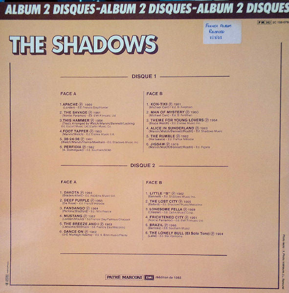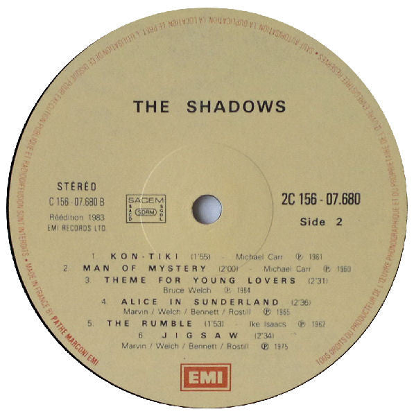 A1-1. Apache A1-2. The Savage A1-3. This Hammer A1-4. Foot Tapper A1-5. 36-24-36 A1-6. Perfidia B1-1. Kon-Tiki B1-2. Man Of Mystery B1-3. Theme For Young Lovers B1-4. Alice In Sunderland B1-5. The Rumble B1-6. Jigsaw A2-1. Dakota A2-2. Deep Purple A2-3. Fandango A2-4. Mustang A2-5. The Breeze And I A2-6. Dance On B2-1. Little 'B' B2-2. The Lost City B2-3. Lonesome Fella B2-4. Frightened City B2-5. Brazil B2-6. The Lonely Bull (El Solo Toro)