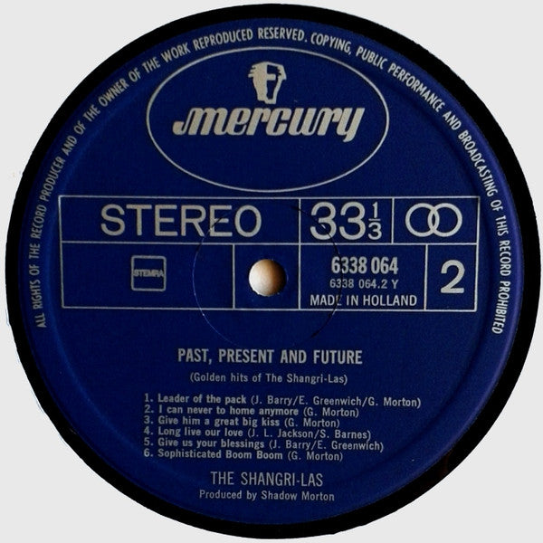 A1. Past, Present And Future 2:40 A2. Train From Kansas City 3:20 A3. Heaven Only Knows 2:10 A4. Remember (Walking In The Sand) 2:17 A5. Out In The Streets 2:47 A6. What Is Love 2:25 B1. Leader Of The Pack 2:53 B2. I Can Never Go Home Anymore 3:13 B3. Give Him A Great Big Kiss 2:10 B4. Long Live Our Love 2:54 B5. Give Us Your Blessings 3:15 B6. Sophisticated Boom Boom 2:08