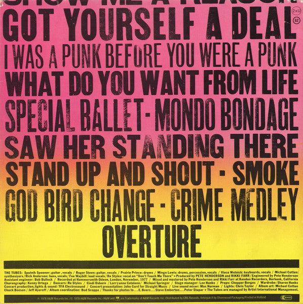 Gatefold sleeve with printed innersleeves. Recorded live at Hammersmith Odeon, London, November, 1977. Mixed and mastered at Kendun Recorders, Burbank, California. Concert presentation: [... for Straight Music. ℗ 1978 A&M Records Inc./© 1978 A&M Records Inc./A&M and [Logo are Trademarks of A&M Records Inc./Distributed by CBS Records./Interpak II by Shorewood Packaging/Printed in Holland [Scribblings in runout might be an etched 'w' or an etched 'ew'. Tracks A1, A2, B2, B4, B5, D1, D2, D4: Pseudo Songs Admin. By Irving Music Inc. Tracks A3, A4, C2: Pseudo Songs Admin. By Irving Music Inc. and Bern Doubt Music Tracks B1, C4: Hitman Music Track B3: Lucky Pork Publ. Track C1.2: Intersong Music/Robbins Music Track C1.3: Northridge Music Track C1.4: April Music Track C1.5: Desilu Music Track C3: Nothern Songs, Ltd. Controlled in U.S. and Canada by Gil Music Copy. Track D3: Madcap Music, Inc./ Northern Music Corp.
