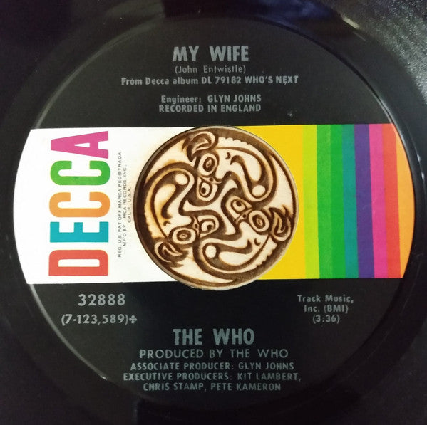Label-factory variant, "✤" symbol on B-side label and "1" etched in runouts denote MCA Pressing Plant, Gloversville, pressing. Remainder of runouts etched. Revised rainbow label design introduced late 1971, with "Mf'd By MCA Records, Inc.," in small print. Engineering credit displayed below title. Catalog number displayed on the left side of the label. From Decca album DL 79182 68469 Recorded In England