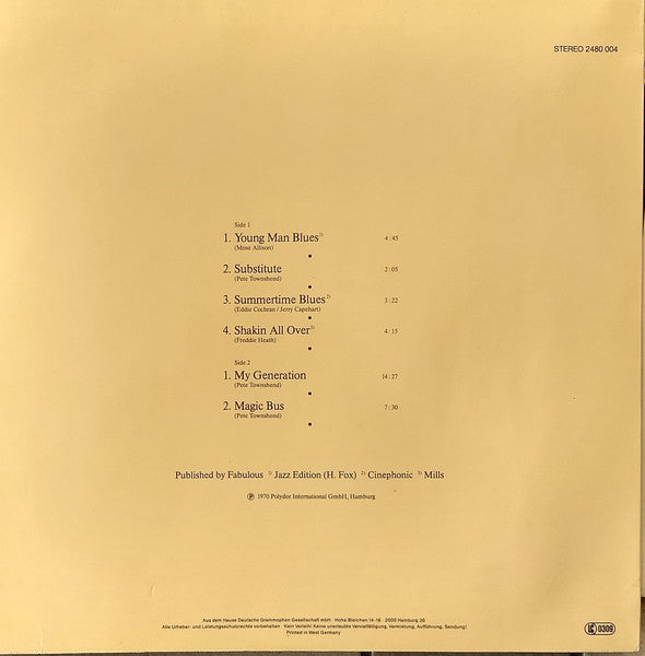 A1. Young Man Blues 4:45 A2. Substitute 2:05 A3. Summertime Blues 3:22 A4. Shakin' All Over 4:15 B1. My Generation 14:27 B2. Magic Bus 7:30