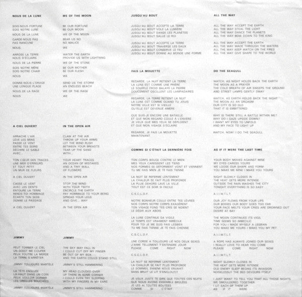 A1. Nous De La Lune 4:23 A2. Jusqu'au Bout 2:32 A3. A Ciel Ouvert 1:45 A4. Jimmy 2:40 A5. Fais La Mouette 4:46 B1. Percussionne 5:23 B2. Feu 3:03 B3. Did You Miss Me? 3:20 B4. Si Tu Gardes 5:55