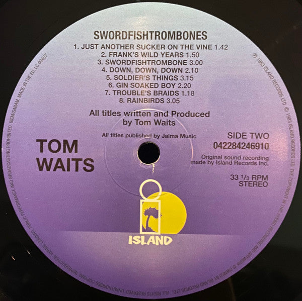 A1. Underground 1:58 A2. Shore Leave 4:12 A3. Dave The Butcher 2:15 A4. Johnsburg, Illinois 1:30 A5. 16 Shells From A 30-6 4:30 A6. Town With No Cheer 4:22 A7. In The Neighborhood 3:04 B1. Just Another Sucker On The Vine 1:42 B2. Frank's Wild Years 1:50 B3. Swordfishtrombone 3:00 B4. Down, Down, Down 2:10 B5. Soldier's Things 3:15 B6. Gin Soaked Boy 2:20 B7. Trouble's Braids 1:18 B8. Rainbirds 3:05