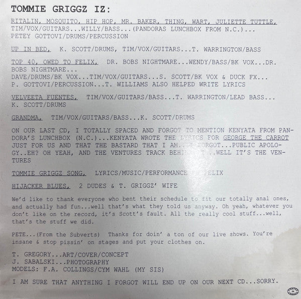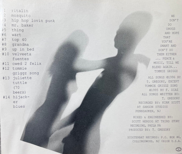1. Ritalin 2. Mosquito 3. Hip Hop Lovin Punk 4. Mr. Baker 5. Thing 6. Wart 7. Top 40 8. Grandma 9. Up In Bed 10. Velveeta Fuentes 11. Owed 2 Felix 12. Tommie Griggz Song 13. Juliette Turtle (70 Beers) 14. Highjacker Blues