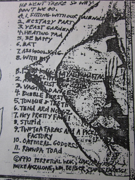 A1. Sitting With Our Friends A2. Ecstasy Party A3. Yeast Garden A4. Heating Pad A5. Be Happy A6. Bat A7. Asswooligig A8. With My B1. The King's Loyal Moustache Clippings B2. Antichrist Fan Club B3. Vagina Dance B4. Bubble Burst B5. Tongue & Teeth B6. Tend Ard Noogz B7. Hey Pretty Face! B8. Stupid B9. Two Tea Farms And A Pickle Factory B10. Oatmeal Goddess B11. Rhonda Toad
