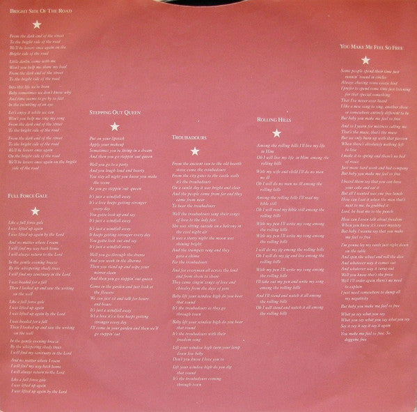 A1. Bright Side Of The Road 3:44 A2. Full Force Gale 3:12 A3. Stepping Out Queen 5:26 A4. Troubadours 4:38 A5. Rolling Hills 2:50 A6. You Make Me Feel So Free 4:05 B1. Angeliou 6:48 B2. And The Healing Has Begun 7:59 B3. It's All In The Game 5:10 B4. You Know What They're Writing About 5:38