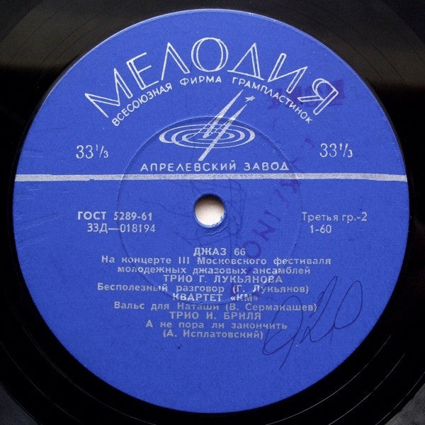 A1. Инструментальный Ансамбль Под Управлением Бориса Фрумкина - Азы A2. Трио Бориса Рычкова - Песня A3.1. Диксиленд Владислава Грачева - Садовое Кольцо A3.2. Диксиленд Владислава Грачева - Раздумье B1. Трио Германа Лукьянова - Бесполезный Разговор B2. Квартет «КМ» - Вальс Для Наташи B3. Трио Игоря Бриля - А Не Пора Ли Закончить