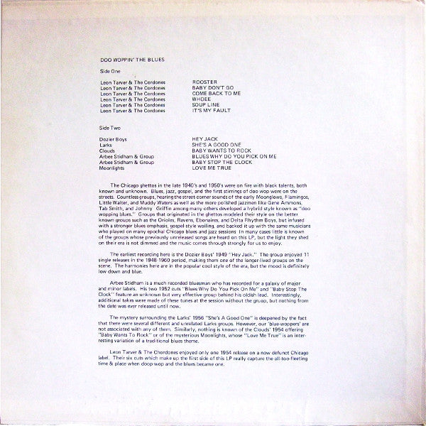 A1. Leon D. Tarver & The Chordones - Rooster A2. Leon D. Tarver & The Chordones - Baby Don't Go A3. Leon D. Tarver & The Chordones - Come Back To Me A4. Leon D. Tarver & The Chordones - Whoee A5. Leon D. Tarver & The Chordones - Soup Line A6. Leon D. Tarver & The Chordones - It's My Fault B1. The Dozier Boys - Hey Jack B2. The Larks (4) - She's A Good One B3. The Clouds (8) - Baby Wants To Rock B4. Arbee Stidham - Blues Why Do You Pick On Me B5. Arbee Stidham - Baby Stop The Clock B6. The Moonlights (3) - Love Me True