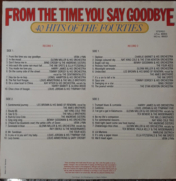 A1. Vera Lynn - From The Time You Say Goodbye 2:22 A2. Glenn Miller And His Orchestra - In The Mood 3:36 A3. Bing Crosby, The Andrews Sisters - Don't Fence Me In 3:04 A4. The Ink Spots, Ella Fitzgerald - Into Each Life Some Rain Must Fall 3:03 A5. Harry James And His Orchestra - You Made Me Love You 3:13 A6. Tommy Dorsey And His Orchestra - On The Sunny Side Of The Street 3:12 A7. Lionel Hampton And His Orchestra - Hey-ba-ba-re-bop 2:59 A8. Louis Armstrong, The Mills Brothers - The Flat Foot Boogie 3:00 A9. Kay Kyser And His Orchestra - On A Slow Boat To China 3:17 A10. Louis Jordan And His Tympany Five - Choo Choo Ch'boogie 2:40 B1. Les Brown And His Band Of Renown - Sentimental Journey 3:17 B2. The Nat King Cole Trio - Route 66 3:03 B3. The Mills Brothers - Say Si Si 2:47 B4. The Andrews Sisters - Rum & Coca Cola 3:10 B5. Benny Goodman And His Orchestra - Sing Sing Sing 2:18 B6. Vera Lynn - (There'll Be Bluebirds Over) The White Cliffs Of Dover 3:16 B7. Glenn Miller And His Orchestra - Serenade In Blue 3:28 B8. The Four Aces - Mr. Sandman 2:33 B9. Louis Jordan And His Tympany Five - Is You Or Is You Ain't My Baby 2:41 B10. Louis Armstrong, Gary Crosby (2) - Lazy Bones 2:55 C1. Charlie Barnet And His Orchestra - Skyliner 3:20 C2. Nat King Cole, Stan Kenton And His Orchestra - Orange Coloured Sky 2:33 C3. Benny Goodman And His Orchestra - Bugle Call Rag 2:55 C4. The Four Aces - Pennies From Heaven 2:19 C5. Glenn Miller And His Orchestra - Moonlight Serenade 3:23 C6. Les Brown And His Band Of Renown - Undecided 2:56 C7. The Ink Spots - It's A Sin To Tell A Lie 2:24 C8. Charlie Barnet And His Orchestra - Opus One 2:55 C9. Bing Crosby - Swinging On A Star 2:28 C10. Stan Kenton And His Orchestra - The Peanut Vendor 4:33 D1. Harry James And His Orchestra - Trumpet Blues & Cantabile 2:39 D2. Louis Jordan And His Tympany Five - Caldonia 2:33 D3. Glenn Miller And His Orchestra - I've Got A Gal In Kalamazoo 3:14 D4. The Mills Brothers - Be My Life's Companion 3:09 D5. The Nat King Cole Trio - For Sentimental Reasons 3:14 D6. The Andrews Sisters - Hold Tight (Want Some Sea Food Mama) 3:14 D7. Glenn Miller And His Orchestra - Chatanooga Choo Choo 3:22 D8. Marlene Dietrich - Lili Marlene 3:22 D9. Ella Fitzgerald, The Ink Spots - It's Only A Paper Moon 2:31 D10. Vera Lynn - We'll Meet Again