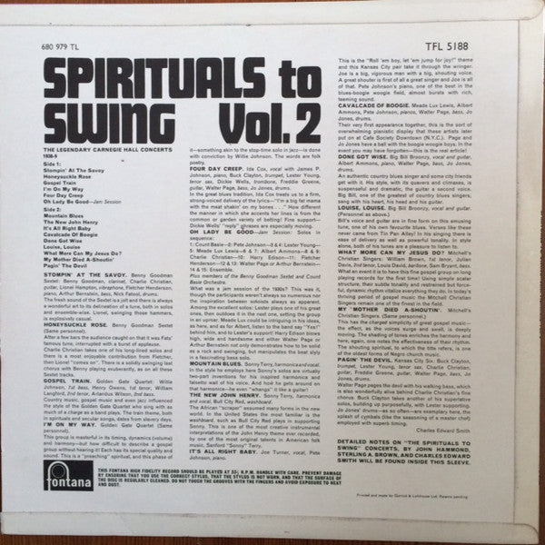 A1. Benny Goodman Sextet - Stompin' At The Savoy A2. Benny Goodman Sextet - Honeysuckle Rose A3. The Golden Gate Quartet - Gospel Train A4. The Golden Gate Quartet - I'm On My Way A5. Ida Cox And Band - Four Day Creep A6. Benny Goodman Sextet, Count Basie Band, Meade "Lux" Lewis, Pete Johnson, Albert Ammons - Oh Lady Be Good (Jam Session) B1. Sonny Terry - Mountain Blues B2. Sonny Terry, Bull City Red - The New John Henry B3. Big Joe Turner, Pete Johnson - It's All Right Baby B4. Pete Johnson, Meade "Lux" Lewis, Albert Ammons, Jo Jones, Walter Page - Cavalcade Of Boogie B5. Big Bill Broonzy, Albert Ammons, Walter Page, Jo Jones - Done Got Wise B6. Big Bill Broonzy, Albert Ammons, Walter Page, Jo Jones - Louise, Louise B7. Mitchell's Christian Singers - What More Can My Jesus Do? B8. Mitchell's Christian Singers - My Mother Died A'Shoutin' B9. Kansas City Six - Pagin' The Devil