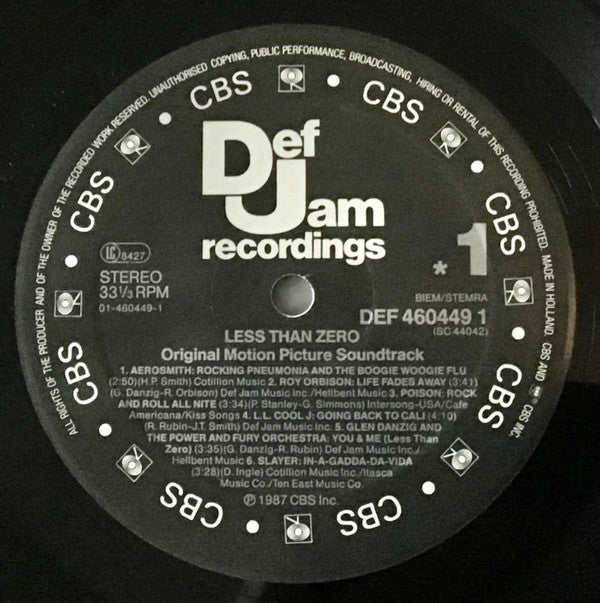 A1. Aerosmith - Rocking Pneumonia And The Boogie Woogie Flu 5:49 A2. Roy Orbison - Life Fades Away 3:41 A3. Poison (3) - Rock And Roll All Nite 3:34 A4. LL Cool J - Going Back To Cali 4:10 A5. Glenn Danzig, The Power And The Fury Orchestra - You And Me (Less Than Zero) 3:35 A6. Slayer - In-A-Gadda-Da-Vida 3:28 B1. Public Enemy - Bring The Noise 3:43 B2. The Black Flames - Are You My Woman? 3:04 B3. Joan Jett & The Blackhearts - She's Lost You 2:54 B4. Oran 'Juice' Jones, Alyson Williams - How To Love Again 4:41 B5. Bangles - Hazy Shade Of Winter 2:31