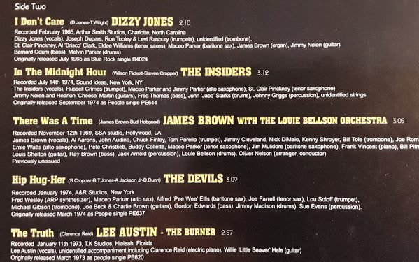 All selections produced by Soul Brother Number One - The Hitman - The Godfather of Soul - Minister of New New Super Heavy Funk - James Brown Unidentified background vocals A1, unidentified strings A2, B2, unidentified accompaniment B5.