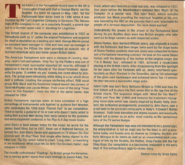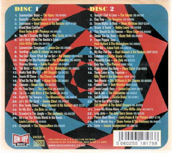 1-1. The Vipers Skiffle Group - Summertime Blues 1-2. Charlie Gracie - Butterfly 1-3. Boyd Bennett And His Rockets - Seventeen 1-4. Vince Taylor And His Playboys - Brand New Cadillac 1-5. Mac Curtis - You Ain't Treating Me Right 1-6. Little Willie John - Let's Rock While The Rockin's Good 1-7. Jamie Coe - Summertime Symphony 1-8. Santo & Johnny - Teardrop 1-9. Ral Donner - You Don't Know What You've Got 1-10. The Silhouettes - Heading For The Poorhouse 1-11. Bobby Freeman - Shimmy Shimmy 1-12. Hank Ballard & The Midnighters - The Twist 1-13. Bill Doggett - Honky Tonk (Part 1) 1-14. The Charms - Hearts Of Stone 1-15. Adam Faith - What Do You Want? 1-16. Duane Eddy - Caravan 1-17. The Jive Five - My True Story 1-18. The John Barry Seven - Zip Zip 1-19. The Moontrekkers - Night Of The Vampire 1-20. Donnie Elbert - Let's Do The Stroll 1-21. Boyd Bennett And His Rockets - Blue Suede Shoes 1-22. Jim Dale - Be My Girl 1-23. The Jayhawks (2) - Stranded In The Jungle 1-24. Laurie London - He's Got The Whole World In His Hands 1-25. The Sleepwalkers (3) - Sleepwalk 2-1. The Tokens - Tonight I Fell In Love 2-2. The Vampires (7) - Clap Trap 2-3. Moon Mullican - Seven Nights To Rock 2-4. Bobby Lewis - Tossin' & Turnin' 2-5. Vince Eager - This Should Go On Forever 2-6. Rusty York - Shake 'Em Up Baby 2-7. Hank Ballard & The Midnighters - Finger Poppin' Time 2-8. Adam Faith - Poor Me 2-9. Boyd Bennett And His Rockets - My Boy Flat Top 2-10. Charlie Gracie - Fabulous 2-11. Jim Dale - Piccadilly Line 2-12. The Platters - Only You 2-13. Vince Taylor - Right Behind You Baby 2-14. Billy Ward And His Dominoes - Three Coins In The Fountain 2-15. Otis Williams & The Charms - Two Hearts 2-16. Bert Weedon - Flannel Foot 2-17. Bonnie Lou - Seven Lonely Days 2-18. The Silhouettes - Get A Job 2-19. Charlie Drake - Splish Splash 2-20. Cliff Bennett & The Rebel Rousers - You've Got What I Like 2-21. Little Willie John - Leave My Kitten Alone 2-22. The John Barry Seven - Long John 2-23. Linda Hayes, The Platters - Please Have Mercy 2-24. Shane Fenton & The Fentones - I'm A Moody Guy 2-25. Sounds Incorporated - Emily