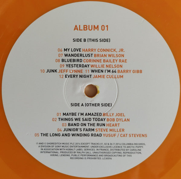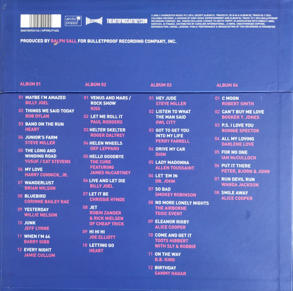 A1. Billy Joel - Maybe I'm Amazed A2. Bob Dylan - Things We Said Today A3. Heart - Band On The Run A4. Steve Miller - Junior's Farm A5. Yusuf Islam - The Long And Winding Road B1. Harry Connick, Jr. - My Love B2. Brian Wilson - Wanderlust B3. Corinne Bailey Rae - Bluebird B4. Willie Nelson - Yesterday B5. Jeff Lynne - Junk B6. Barry Gibb - When I'm 64 B7. Jamie Cullum - Every Night . Album 02 C1. Kiss - Venus And Mars / Rock Show C2. Paul Rodgers - Let Me Roll It C3. Roger Daltrey - Helter Skelter C4. Def Leppard - Helen Wheels C5. The Cure, James McCartney - Hello Goodbye D1. Billy Joel - Live And Let Die D2. Chrissie Hynde - Let It Be D3. Robin Zander, Rick Nielsen - Jet D4. Joe Elliott - Hi Hi Hi D5. Heart - Letting Go . Album 03 E1. Steve Miller - Hey Jude E2. Owl City - Listen To What The Man Said E3. Perry Farrell - Got To Get You Into My Life E4. Dion (3) - Drive My Car E5. Allen Toussaint - Lady Madonna E6. Dr. John - Let 'Em In F1. Smokey Robinson - So Bad F2. The Airborne Toxic Event - No More Lonely Nights F3. Alice Cooper - Eleanor Rigby F4. Toots Hibbert, Sly & Robbie - Come And Get It F5. B.B. King - On The Way F6. Sammy Hagar - Birthday . Album 04 G1. Robert Smith - C Moon G2. Booker T. Jones - Can't Buy Me Love G3. Ronnie Spector - P.S. I Love You G4. Darlene Love - All My Loving H1. Ian McCulloch - For No One H2. Peter Bjorn And John - Put It There H3. Wanda Jackson - Run Devil Run H4. Alice Cooper - Smile Away