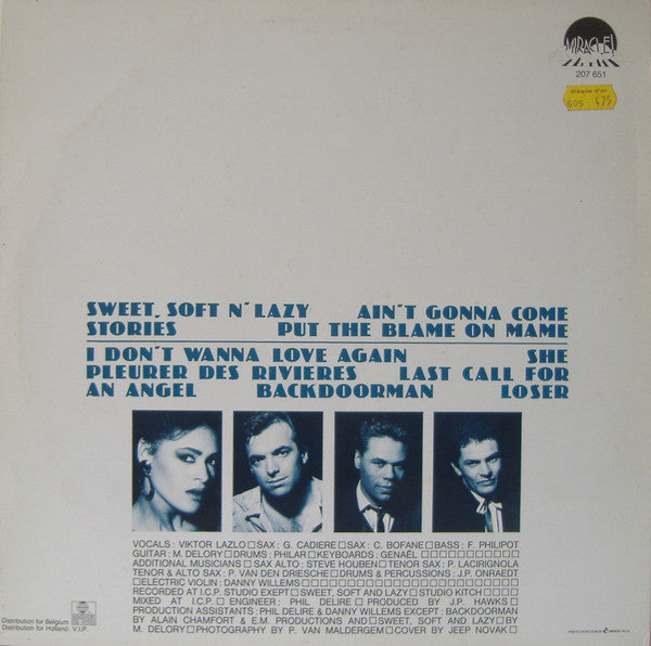 Recorded at I.C.P. Studio except track A2 at Studio Kitch Mixed at I.C.P. Distribution for Belgium Ariola Distribution for Holland: V.I.P. Printed in Belgium by Druco Halle Made in Belgium
