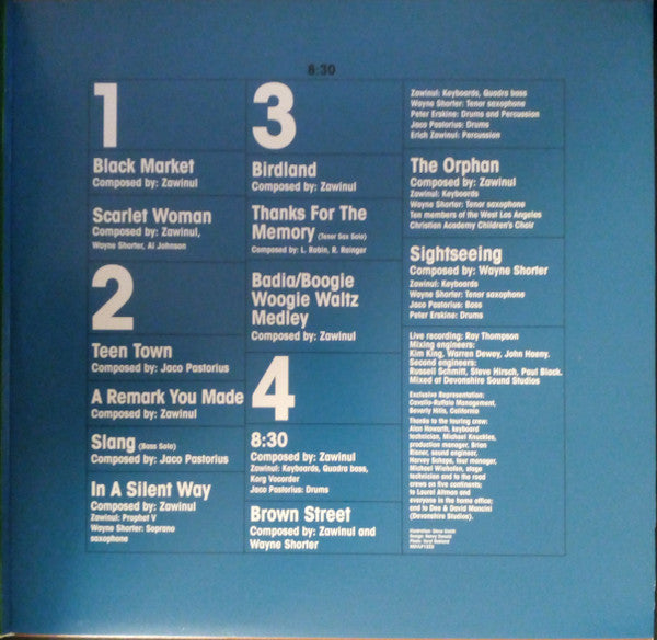 A1. Black Market 9:15 A2. Scarlet Woman 8:24 B1. Teen Town 5:50 B2. A Remark You Made 7:40 B3. Slang (Bass Solo) 4:32 B4. In A Silent Way 2:34 C1. Birdland 6:34 C2. Thanks For The Memory (Tenor Sax Solo) 3:21 C3. Badia / Boogie Woggie Waltz Medley 9:28 D1. 8:30 2:55 D2. Brown Street 8:36 D3. The Orphan 3:14 D4. Sightseeing 5:34