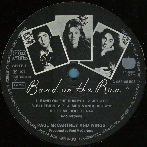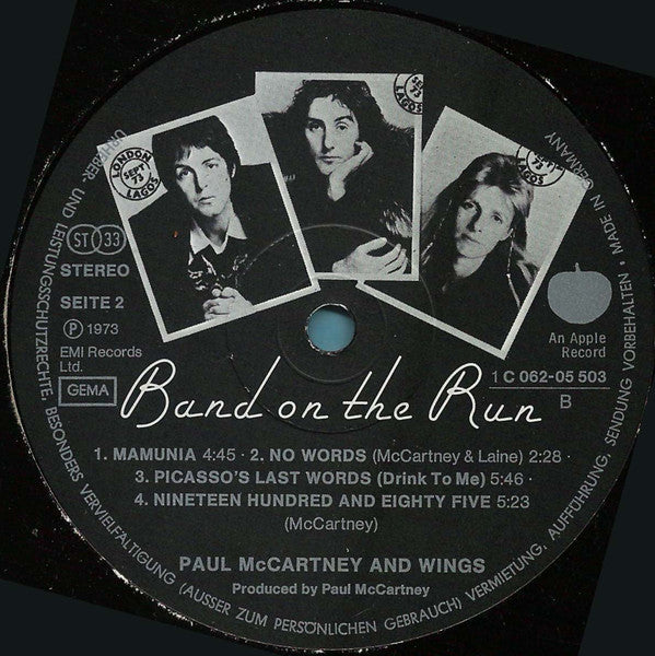 A1. Band On The Run 5:01 A2. Jet 4:00 A3. Bluebird 3:17 A4. Mrs. Vandebilt 4:33 A5. Let Me Roll It 4:44 B1. Mamunia 4:45 B2. No Words 2:28 B3. Picasso's Last Words (Drink To Me) 5:46 B4. Nineteen Hundred And Eighty Five 5:23
