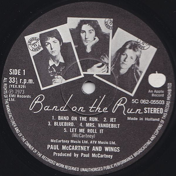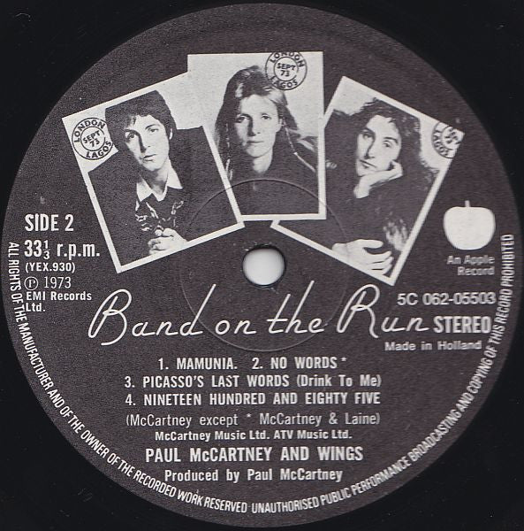 A1. Band On The Run A2. Jet A3. Bluebird A4. Mrs. Vandebilt A5. Let Me Roll It B1. Mamunia B2. No Words B3. Picasso's Last Words (Drink To Me) B4. Nineteen Hundred And Eighty Five