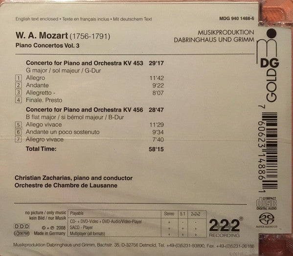 . Concerto for piano and orchestra KV 453 in G major 1. Allegro 11:422. Andante 9:223. Allegretto 8:074. Finale Presto 8:07. Concerto for piano and orchestra KV 456 in B flat major 5. Allegro vivace 11:296. Andante un poco sostenuto 9:347. Allegro vivace 7:40