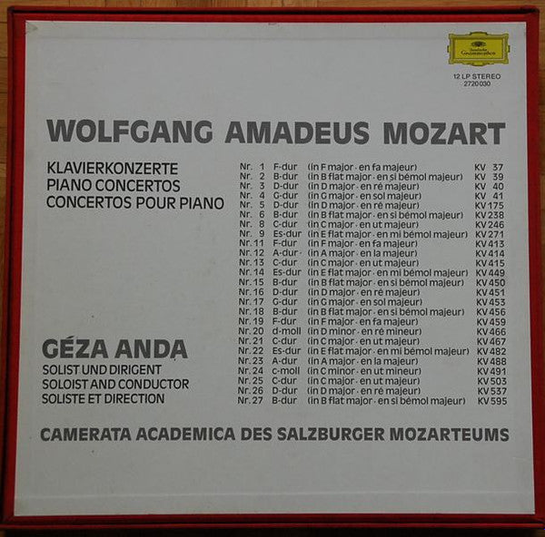 . Konzert Nr. 1 F-Dur (In F Major - En Fa Majeur) KV 37 . Konzert Nr. 2 B-Dur (In B Flat Major - En Si Bémol Majeur) KV 39 . Konzert Nr. 3 D-Dur (In D Major - En Ré Majeur) KV 40 . Konzert Nr. 4 G-Dur (In G Major - En Sol Majeur) KV 41 . Konzert Nr. 5 D-Dur (In D Major - En Ré Majeur) KV 175 . Konzert Nr. 8 C-Dur (In C Major - En Ut Majeur) KV 246 . Konzert Nr. 6 B-Dur (In B Flat Major - En Se Bémol Majeur) KV 238 . Konzert Nr. 9 Es-Dur (In E Flat Major - En Mi Bémol Majeur) KV 271 . Konzert Nr. 11 F-Dur (In F Major - En Fa Majeur) KV 413 . Konzert Nr. 12 A-Dur (In A Major - En La Majeur) KV 414 . Konzert Nr. 13 C-Dur (In C Major - En Ut Majeur) KV 415 . Konzert Nr. 14 Es-Dur (In E Flat Major - En Mi Bémol Majeur) KV 449 . Konzert Nr. 15 B-Dur (In B Flat Major - En Si Bémol Majeur) KV 450 . Konzert Nr. 16 D-Dur (In D Major - En Ré Majeur) KV 451 . Konzert Nr. 17 G-Dur (In G Major - En Sol Majeur) KV 453 . Konzert Nr. 18 B-Dur (In B Flat Major - En Si Bémol Majeur) KV 456 . Konzert Nr. 19 F-Dur (In F Major - En Fa Majeur) KV 459 . Konzert Nr. 20 D-Moll (In D Minor - En Ré Mineur) KV 466 . Konzert Nr. 21 C-Dur (In C Major - En Ut Majeur) KV 467 . Konzert Nr. 23 A-Dur (In A Major - En La Majeur) KV 488 . Konzert Nr. 22 Es-Dur (In E Flat Major - En Mi Bémol Majeur) KV 482 . Konzert Nr. 24 C- Moll (In C Minor - En Ut Mineur) KV 491 . Konzert Nr. 25 C-Dur (In C Major - En Ut Majeur) KV 503 . Konzert Nr. 26 D-Dur (In D Major - En Ré Majeur) KV 537 (Krönungskonzert • Coronation • Couronnement) . Konzert Nr. 27 B-Dur (In B Flat Major - En Si Bémol Majeur) KV 595