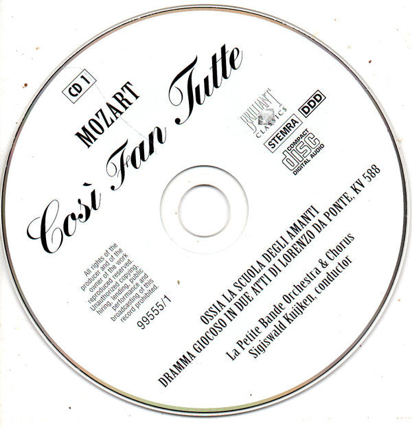 . Act 1 1-1. Ouverture 4:50. Scene 1 1-2. Terzetto: La Mia Dorabella Capace Non È - Recitativo: Fuor La Spada! 2:531-3. Terzetto: E La Fede Delle Femmine - Recitativo: Scioccherie Di Poeti! 2:521-4. Terzetto: Una Bella Serenata 2:22. Scene 2 1-5. Duetto: Ah Guarda, Sorella - Recitativo: Mi Par, Che Stammatina 5:461-6. Aria: Vorrei Dir, E Cor Non Ho - Recitativo: Stelle! Per Carità, Signor Alfonso 1:491-7. Quintetto: Sento, O Dio, Che Questo Piede - Recitativo: Non Piangere, Idol Mio! 4:571-8. Duettino: Al Fatto Dan Legge... - Recitativo: La Comedia È Graziosa 1:521-9. Coro: Bella Vita Militar - Recitativo: Non V'è Piu Tempo, Amici 2:071-10. Quintetto: Di Scrivermi Ogni Giorno - Coro: Bella Vita Militar - Recitativo: Dove Son 3:491-11. Terzettino: Soave Sia Il Vento - Recitativo: Non Son Cattivo Comico - Recitativo: Che Vita Maledetta 5:13. Scene 3 1-12. Recitativo: Ah! Scostati! Paventa Il Tristo - Aria: Scamie Implacabili, Che M'Agitate - Recitativo: Signora Dorabella... 4:391-13. Aria: In Uomini, In Soldati Sperare... - Recitativo: Che Silenzio! Che Aspetto... 5:591-14. Sestetto: Alla Bella Despinetta - Recitativo: Che Sussurro! Che Strepito 6:441-15. Recitativo: Temerari! Sortite Fuori... - Aria: Come Scoglio - Recitativo: Ah, Non Partite! 6:391-16. Aria: Non Siate Ritrosi 1:411-17. Terzetto: E Voi Ridete? - Recitativo: Si Può Sapere Un Poco... 1:561-18. Aria: Un'Aura Amorosa Del Nostro Tresoro - Recitativo: O La Saria Da Ridere 7:09. Act 1 (Cont) . Scene 4 2-1. Finale: Ah, Che Tutta In Un Momento 2:192-2. Si Mora, Si, Si Mora 4:352-3. Eccovi Il Medico, Signore Belle 7:002-4. Dammi Un Bacio, O Mio Tesoro 3:43. Act 2 . Scene 1 2-5. Recitativo: Andante Là, Che Siete Due... 3:212-6. Aria: Una Donna A Quindici Anni - Recitativo: Sorrella, Cosa Dici? 5:112-7. Duetto: Prederò Quel Brunettino 3:04. Scene 2 2-8. Duetto Con Coro: Secondate, Aurette Amiche - Recitativo: Il Tutto Deponete Sopra... 4:392-9. Quartetto: La Mano A Me Date - Recitativo: Oh Che Bella Giornata 5:492-10. Duetto: Il Coro Vi Dono 4:082-11. Recitativo: Barbara! Perchè Fuggi! - Aria: Ah! Lo Veggio, Quell'Anima Bella 5:142-12. Recitativo: Ei Parte, Senti, Ah No! - Rondo: Per Pietà, Ben Mio, Perdona 8:04. Act 2 (Cont) . Scene 2 Cont. 3-1. Recitativo: Amico, Abbiamo Vinto! 4:133-2. Aria: Donne Mie, La Fate A Tanti, A Tanti 3:073-3. Recitativo: In Qual Fiero Contrasto - Cavatina: Tradito, Schernito Dal Perfido, Cor - Recitativo: Bravo! Questo È Constanza! - Recitativo: Ora Vedo Che Siete Una Donna Di Garbo 7:09. Scene 3 3-4. Aria: E Amore Un Ladroncello -Recitativo: Come Tutto Congiura A Sedurre... 5:553-5. Duetto: Fra Gli Amplessi In Pochi Istanti - Recitativo: Ah, Poveretto Me, Cosa Ho Veduto 7:593-6. Andante: Tutte Accusan Le Donne - Recitativo: Vittoria Padroncini 1:39. Scene 4 3-7. Finale: Fate Presto, O Cari Amici 1:473-8. Benedetti I Doppi Coniugi 3:583-9. E Nel Tuo, Nel Mio Bicchiero 1:353-10. Miei Signori, Tutto È Fatto 3:193-11. Sani E Salvi Agli Amplessi Amorosi 9:48