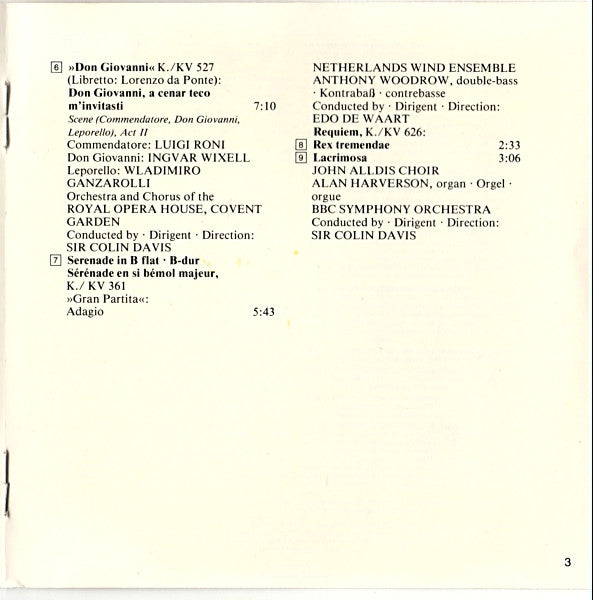 1. Erik Smith - Klavierstück In F, K. 33B 1:082. The Academy Of St. Martin-in-the-Fields, Sir Neville Marriner - Symphony No. 25 In G Minor, K. 183: Allegro Con Brio 7:393. The Academy Of St. Martin-in-the-Fields, Sir Neville Marriner - Concerto For Flute And Harp In C, K. 299: Andantino 8:304. The London Symphony Orchestra, Sir Colin Davis - Sinfonia Concertante In E Flat, K. 364: Andante Maestoso 13:105. The Academy Of St. Martin-in-the-Fields, Sir Neville Marriner - Piano Concerto No. 22 In E Flat, K.482: Allegro - Andante Cantabile - Tempo I 11:556. Chorus Of The Royal Opera House, Covent Garden, Orchestra Of The Royal Opera House, Covent Garden, Sir Colin Davis - Don Giovanni, K. 527 - Act II: "Don Giovanni, A Cenar Teco M'invitasti" 7:107. Nederlands Blazers Ensemble, Edo De Waart - Sernade In B Flat, K. 361 "Gran Partita": Adagio 5:43. BBC Symphony Orchestra, Sir Colin Davis - Requiem, K. 626