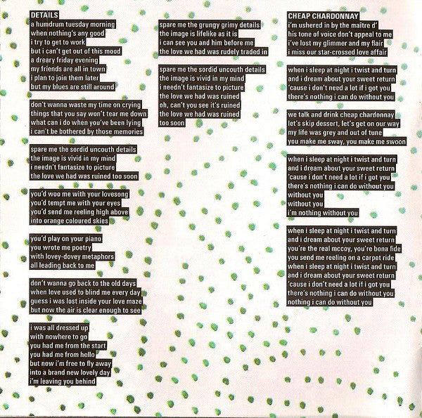1. Details 3:362. Cheap Chardonnay 3:523. Just What I Need 3:484. Fantastic 3:325. Breezy 3:576. Ride That Sunbeam 3:197. A Distant Melody 3:178. Nothing's Any Good 3:479. Interpretation Of Love 3:3510. Don't Ask 3:1711. Would You 3:1012. Useless Fraud 3:19. Bonustracks 13. As Long As We're In Love 4:3614. While I'll Be Gone 2:3015. Maybe I'll Enjoy It Next Year 3:27