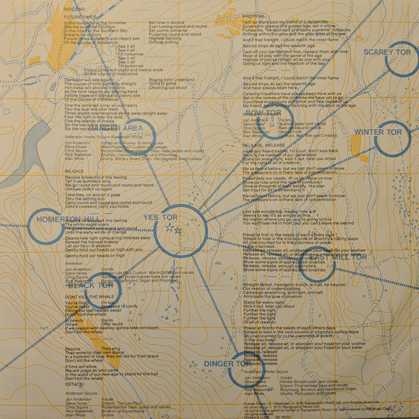 [Back cover: Bottom right SD 19202 ([l681 logo) ATLANTIC RECORDING CORPORATION 75 ROCKEFELLER PLAZA, NEW YORK, NEW YORK 10019 ([l22328 logo) A [l552180 Company ©1978 Atlantic Recording Corporation and Star/Rights Co. Printed in U.S.A. [Spine notes YES TORMATO ATLANTIC SD 19202 [Vinyl inner sleeve, SIDE ONE, bottom right "Future Times" & "Madrigal" © 1978 Topographic Music Ltd. and Rondor Music Ltd. All other songs © 1978 Topographic Music Ltd. All rights for the world on behalf of Topographic Music Ltd. administered by WB Music Corp All rights reserved. Printed in U.S.A. SD 19202 [Vinyl inner sleeve, SIDE TWO, bottom left "Arriving UFO" © 1978 Topographic Music Ltd. and Rondor Music Ltd. All other songs © 1978 Topographic Music Ltd. All rights for the world on behalf of Topographic Music Ltd. administered by WB Music Corp All rights reserved. Sleeve & jacket design © 1978 Atlantic Recording Corporation and Star/Rights Co. [Vinyl inner sleeve, SIDE TWO, Bottom right All tracks arranged and produced by YES Recording engineers [a171127 and [a287356 Assisted by [a173021 and [a79510 [a1311087 arrangement and orchestration on "Onward" and string arrangement on "Madrigal" from an original ideal by [a149420 Disc cutting Sean Davis at Strawberry Studios, London Recorded at [l265265, London Mixing and additional recording at [l269875, London Executive producer 'we owe it all to' Brian Lane Special thanks to: Jake Berry, Sandy Camppell, Toby Errington, Pat Fairley, Jacki Field, Brenda Franklin, Jim Halley, Ray Jones, John Martin, Michael Tait, Claude Johnson Taylor, Nu Nu Whiting, and all the Garys from South Shields who have been with us through "ten true sommers long". Sleeve design by Hipgnosis | Photography Hipgnosis/Brimson Graphics Colin Elgie YES logo designed by Roger Dean [a149420 appears courtesy of [l904 Thanks to Damion James for being "a chip off the old block" on "Circus Of Heaven" [a50263 Tor is situated two-and-a-half miles from Okehampton, Devon in England, on a clear day, from the top, you can see far away places with strange sounding names. [Disc label both sides as single line runout MFG BY ATLANTIC RECORDING CORP., 75 ROCKEFELLER PLAZA, N.Y., N.Y. ([l22328 logo) A WARNER COMMUNICATIONS COMPANY [Disc label notes left SD 19202 STEREO CRC [Disc label both sides right SIDE ONE | SIDE TWO ℗ 1978 Atlantic [Disc label both sides bottom middle after the tracks and composer notes All songs published by Topographic Music Inc., ASCAP administered by WB Music Corp. Arranged and produced by Yes (ST-A-784145) | (ST-A-784146) Music Ltd. (2, 3 & 5) ([l681 logo)