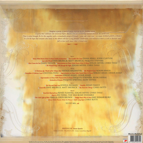 A1. Yo-Yo Ma - Dona Nobis Pacem (Give Us Peace) A2. Diana Krall, John Clayton, Yo-Yo Ma - You Couldn't Be Cuter A3. Dave Brubeck, Matthew Brubeck, Yo-Yo Ma - Joy To The World A4. James Taylor (2), Yo-Yo Ma - Here Comes The Sun A5. Edgar Meyer, Chris Thile, Yo-Yo Ma - Improvisation On Dona Nobis Pacem (Give Us Peace) A6. Edgar Meyer, Chris Thile, Yo-Yo Ma - The Wassail Song / All Through The Night B1. Natalie MacMaster, Yo-Yo Ma - A Christmas Jig / Mouth Of The Tobique Reel B2. Alison Krauss, Yo-Yo Ma - The Wexford Carol B3. Cristina Pato, Yo-Yo Ma - Panxoliña: A Galician Carol B4. Sérgio Assad, Odair Assad, Yo-Yo Ma - Improvisation On Dona Nobis Pacem (Give Us Peace) B5. Sérgio Assad, Odair Assad, Yo-Yo Ma - Vassourinhas B6. Paquito D'Rivera, Alon Yavnai, Yo-Yo Ma - Improvisation On Dona Nobis Pacem (Give Us Peace) B7. Paquito D'Rivera, Alon Yavnai, Yo-Yo Ma - Invitación Al Danzón C1. Joshua Redman, Yo-Yo Ma - My One And Only Love C2. Sérgio & Odair Assad, Yo-Yo Ma - Familia C3. Dave Brubeck, Matthew Brubeck, Yo-Yo Ma - Concordia C4. Chris Botti, Yo-Yo Ma - My Favorite Things D1. Renée Fleming, Edgar Meyer, Chris Thile, Yo-Yo Ma - Touch The Hand Of Love D2. Wu Tong, The Silk Road Ensemble - Kuai Le D3. Amelia Zirin Brown, Yo-Yo Ma - This Little Light Of Mine D4. Jake Shimabukuro, Yo-Yo Ma - Happy Xmas (War Is Over) D5. Chris Botti, Yo-Yo Ma - Dona Nobis Pacem (Give Us Peace) / Auld Lang Syne