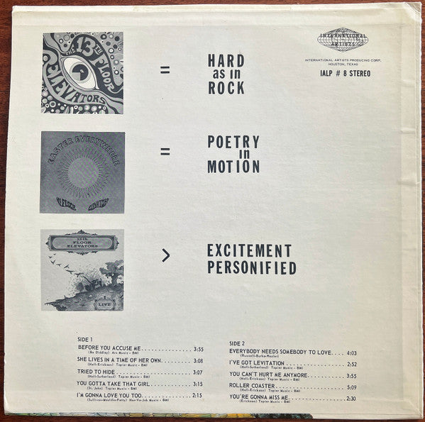 A1. Before You Accuse Me 3:55 A2. She Lives In A Time Of Her Own 3:08 A3. Tried To Hide 3:07 A4. You Gotta Take That Girl 3:15 A5. I'm Gonna Love You Too 2:15 B1. Everybody Needs Somebody To Love 4:03 B2. I've Got Levitation 2:52 B3. You Can't Hurt Me Anymore 3:55 B4. Roller Coaster 5:09 B5. You're Gonna Miss Me 2:30