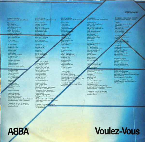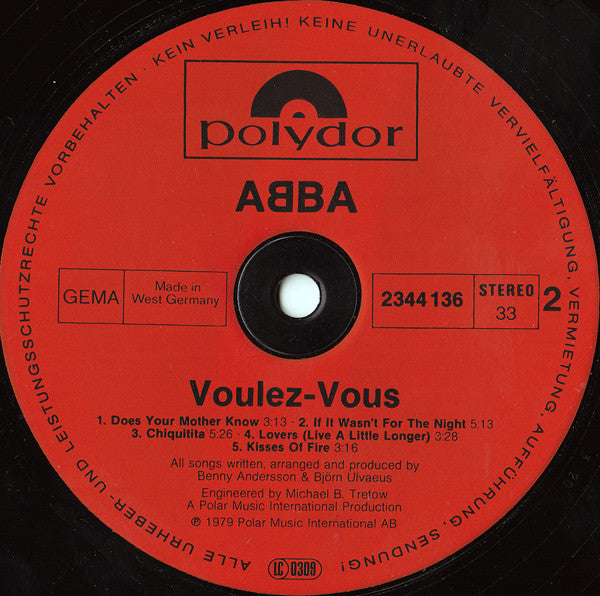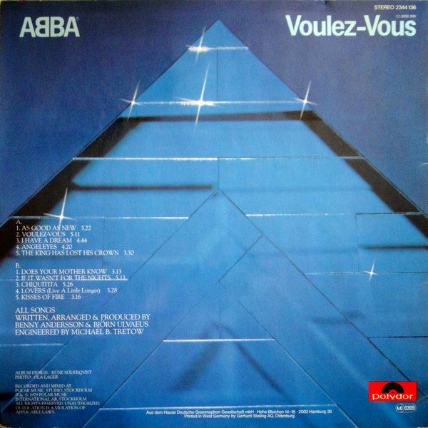 Comes with lyrics on the inner sleeve. Backing track for "Voulez-Vous" recorded at Criteria Studios, Miami. Backing track for "Lovers" recorded at Marcus Music Studio, Stockholm. Recorded and mixed at Polar Music Studio, Stockholm. ℗ 1979 Polar Music International AB, Stockholm. ℗&© 1979 Polar Music International AB, Stockholm Made and Printed in West Germany