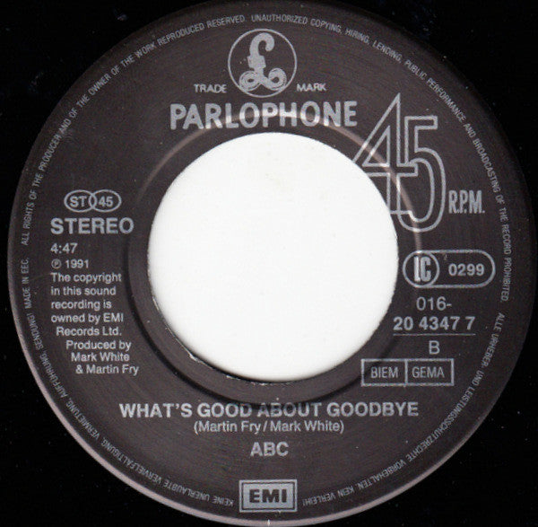 ℗ 1991 the copyright in this sound recording is owned by EMI Records Ltd. Made in EEC © 1991 EMI Records Ltd. Marketed & distributed by EMI. Sleeve lists track B title as "What's Good About Goodbye?". Catalog number appers also as "016 2043477" on the sleeve.