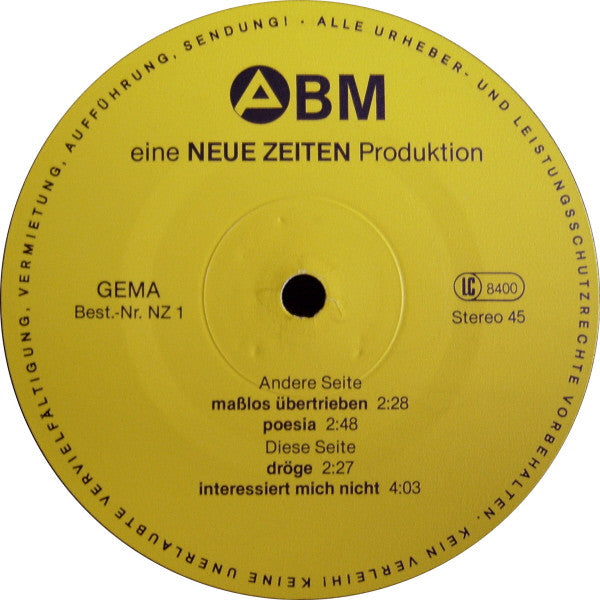 A1. Dröge 2:27 A2. Interessiert Mich Nicht 4:03 . Andere Seite B1. Maßlos Übertrieben 2:28 B2. Poesia 2:48