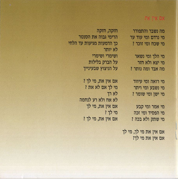 1. If Not You (Im Ein At) 4:512. You're Far Away From Me (At Rechoka Memeni) 4:513. Mushrooms (Pitriot) 3:124. Millimeter 3:215. Nanua 4:126. But Love (Aval Ahava) 3:317. The Snail (Shabul) 3:188. Expanding In The Light (Mitrakhev Be'Or) 4:529. Morning (Boker) 3:4710. To Touch The Dream (Nigah Al Ha'Khalom) 3:1811. Terminal (Terminel Lominlat) Bonus Track 5:40