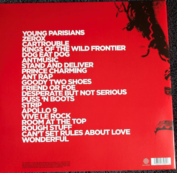 A1. Adam And The Ants - Young Parisians A2. Adam And The Ants - Zerøx A3. Adam And The Ants - Car Trouble A4. Adam And The Ants - Kings Of The Wild Frontier A5. Adam And The Ants - Dog Eat Dog B1. Adam And The Ants - Antmusic B2. Adam And The Ants - Stand and Deliver B3. Adam And The Ants - Prince Charming B4. Adam And The Ants - Ant Rap C1. Adam Ant - Goody Two Shoes C2. Adam Ant - Friend Or Foe C3. Adam Ant - Desperate But Not Serious C4. Adam Ant - Puss 'n Boots C5. Adam Ant - Strip C6. Adam Ant - Apollo 9 D1. Adam Ant - Vive Le Rock D2. Adam Ant - Room At The Top D3. Adam Ant - Rough Stuff D4. Adam Ant - Can't Set Rules About Love D5. Adam Ant - Wonderful