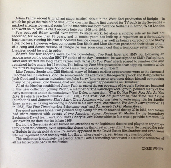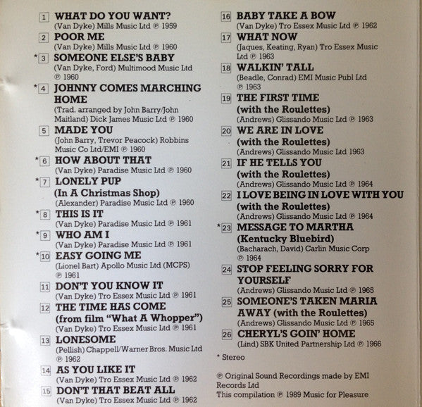 1. What Do You Want? 1:372. Poor Me 1:463. Someone Else's Baby 2:034. Johnny Comes Marching Home 1:575. Made You 1:446. How About That 1:537. Lonely Pup (In A Christmas Shop) 1:478. This Is It 1:469. Who Am I 1:5610. Easy Going Me 1:5411. Don't You Know It 2:0712. The Time Has Come (From The Film "What A Whopper") 2:1013. Lonesome 2:4414. As You Like It 2:0215. Don't That Beat All 2:0916. Baby Take A Bow 1:5917. What Now 1:5718. Walkin' Tall 2:0519. The First Time (With The Roulettes) 2:0320. We Are In Love (With The Roulettes) 2:1321. If He Tells You (With The Roulettes) 2:1222. I Love Being In Love With You (With The Roulettes) 2:0223. Message To Martha (Kentucky Bluebird) 3:0824. Stop Feeling Sorry For Yourself 3:0525. Someone's Taken Maria Away (With The Roulettes) 2:4426. Cheryl's Goin' Home 2:16