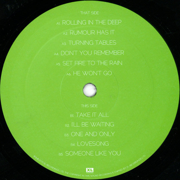 A1. Rolling In The Deep 3:46 A2. Rumour Has It 3:39 A3. Turning Tables 4:06 A4. Don't You Remember 4:00 A5. Set Fire To The Rain 3:58 A6. He Won't Go 4:30 B1. Take It All 3:44 B2. I'll Be Waiting 3:56 B3. One And Only 5:45 B4. Lovesong 5:12 B5. Someone Like You 4:40