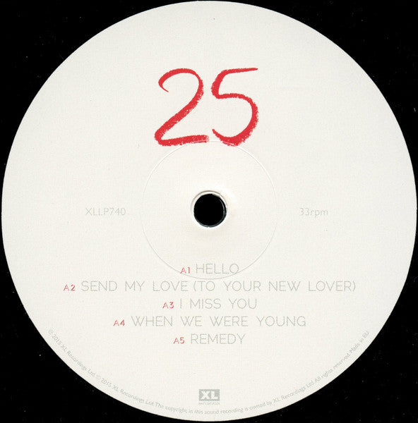 A1. Hello 4:52 A2. Send My Love (To Your New Lover) 3:38 A3. I Miss You 5:45 A4. When We Were Young 4:44 A5. Remedy 3:58 B1. Water Under The Bridge 3:56 B2. River Lea 3:42 B3. Love In The Dark 4:42 B4. Million Years Ago 3:45 B5. All I Ask 4:26 B6. Sweetest Devotion 4:08