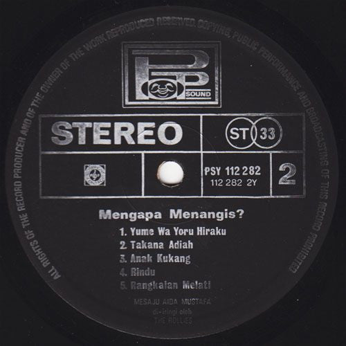 A1. Mengapa Menangis? A2. Renunganku A3. Derita Hatiku A4. Lisoi A5. Madedek Maggambiri A6. Pilu B1. Yume Wa Yoru Hiraku B2. Takana Adiah B3. Anak Kukang B4. Rindu B5. Rangkaian Melati