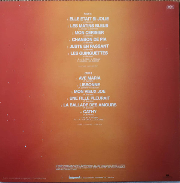 A1. Elle Était Si Jolie 2:57 A2. Les Matins Bleus 2:55 A3. Mon Cerisier 2:30 A4. Chanson De Pia 2:20 A5. Juste En Passant 3:55 A6. Les Guinguettes 2:35 B1. Ave Maria 2:10 B2. Lisbonne 1:55 B3. Mon Vieux Joe 2:43 B4. Une Fille Pleurait 2:55 B5. La Ballade Des Amours 2:35 B6. Cathy 2:27