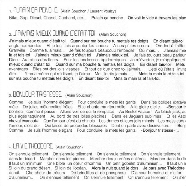 1. Putain Ça Penche 3:542. J'Aimais Mieux Quand C'Était Toi 4:023. Bonjour Tristesse 3:214. La Vie Théodore 3:535. En Collant L'Oreille Sur L'Appareil 4:176. À Cause D'Elle 3:447. Et Si En Plus Y'A Personne 4:098. Le Mystère 3:569. Le Marin 2:5610. L'Île Du Dédain 3:2411. Lisa 2:27