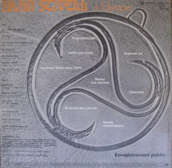 Gravure Universelle mono/stéréo Made in France (on Labels) Ⓤ stéréo : 6399 005 Made in France (should be "Printed in France") JAT Chatillons 92 (on back cover) Enregistrement public (Live recording) à l'Olympia, Paris, le 28 février 1972. Laminated cover: - on front: photo of Alan Stivell, Gabriel Yacoub & Gérard Levasseur (from left side to right side) on stage - on back: photo of Alan Stivell's personal triskell with favourite Stivell's themes: « Retour aux sources », « Diversité des cultures », « Exprimer soi », « Progressive-folk », « Celtic pop-music », « Monde technologique », « Sonerezh Geltia bloaz 2000 », « Futurisme » No tracks' durations on this release - data come from wiki database; french translations for titles are not stated on release. According to en.wikipedia.org, this Fontana 6399 005 is the original french release.