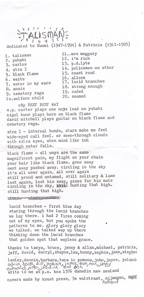 1. Talisman 2. Yuhahi 3. Carlos 4. Xtra I 5. Black Flame 6. Waits 7. Water In My Ears 8. Anais 9. Cemetery Raga 10. Welfare Child 11. Mrs. Meggary 12. I'm Rich 13. P.D. Lyte 14. Policemen On Ether 15. Coast Road 16. Allone 17. Lucid Branches 18. Strong Enough 19. Coded 20. Seamed