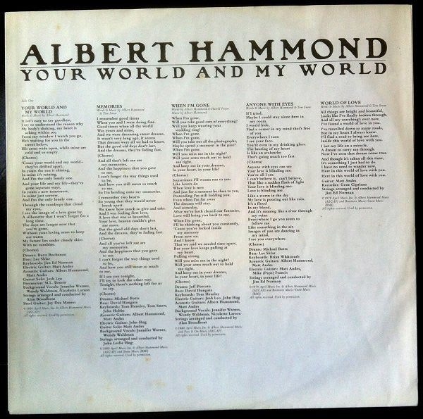 A1. Your World And My World 3:48 A2. Memories 3:12 A3. When I'm Gone 4:22 A4. Anyone With Eyes 3:22 A5. World Of Love 2:08 B1. I Want You Back Here With Me 3:34 B2. Experience 3:24 B3. Take Me Sailing 2:40 B4. By The Night 4:28 B5. I'm A Camera 2:13
